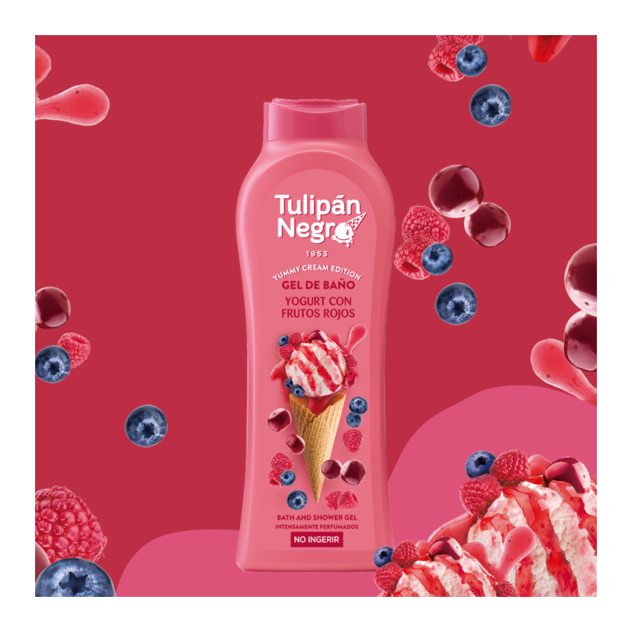 Gel de Ducha yogurt con frutos rojos / Tulipán Negro , Gracias a su deliciosa fragancia , fresca y estimulante , proporciona de inmediato toda la energía y vitalidad que concentran en su interior los frutos rojos , aportando una increíble sensación de limpieza e hidratación a la piel